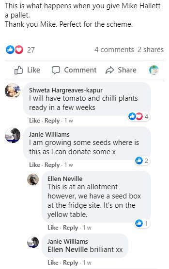 Throughout the coming months there will be seeds, seedlings, flower and veg plants in pots for folks to take home and grow on. We accept donations from allotment holders, gardeners and households to share the satisfying experience of growing for any who wish to take part. Pictures of successes or interesting results are very welcome.